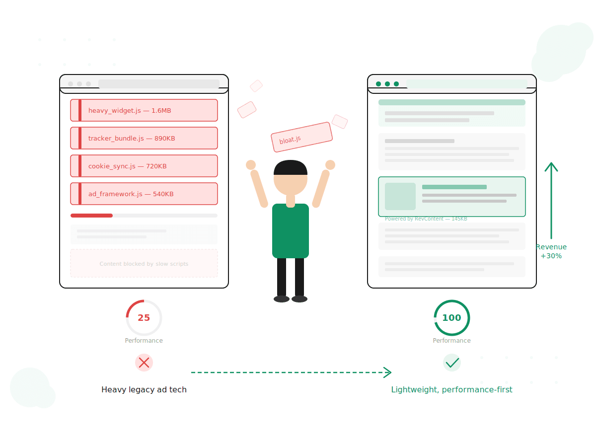 Many content recommendation platforms position themselves as easy revenue drivers. But what’s often overlooked is their true cost to site performance. Heavy, legacy platforms often rely on bloated code, while lightweight ad tech is designed to minimize performance impact from the start.